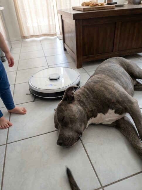 The Roborock was running its scheduled afternoon cycle. It had been running for about six minutes. Boone had been lying on the cool kitchen tile near the back patio doors — his favorite afternoon spot — with his eyes closed.
